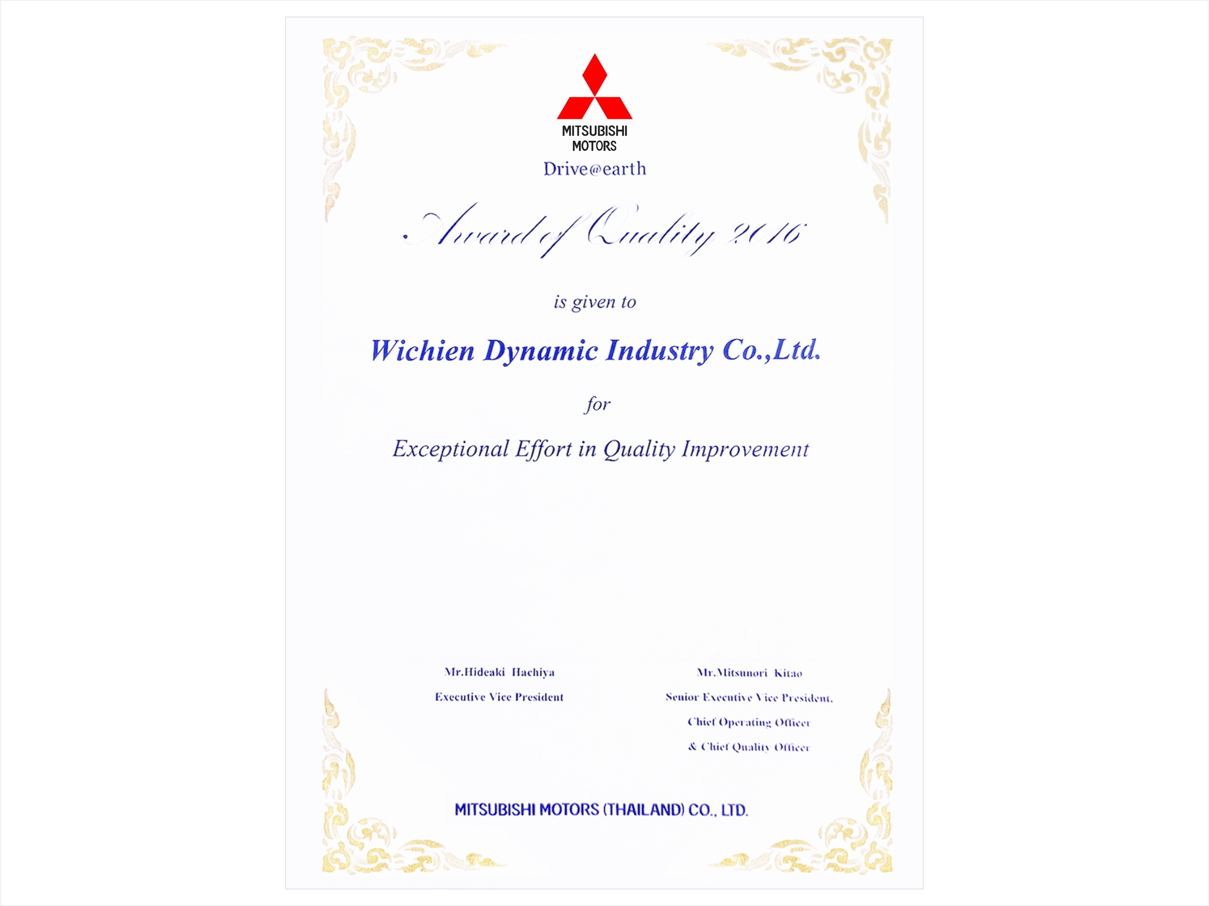 บริษัท Wichien Dynamic Industry Co., Ltd. รู้สึกเป็นเกียรติอย่างยิ่งที่ได้รับ Award of Quality 2016 (รางวัลคุณภาพ ประจำปี 2016) จาก Mitsubishi Motors (Thailand) Co., Ltd.รางวัลอันทรงเกียรตินี้มอบให้แก่บริษัทฯ เพื่อยกย่องถึง ความมุ่งมั่น ทุ่มเท และความเป็นเลิศในการพัฒนาคุณภาพอย่างต่อเนื่อง ซึ่งสะท้อนถึงมาตรฐานการผลิต การควบคุมคุณภาพ และความร่วมมืออันดีระหว่างบริษัทฯ กับพันธมิตรทางธุรกิจ บริษัทฯ ขอขอบคุณ Mitsubishi Motors สำหรับความไว้วางใจ และจะยังคงยึดมั่นในการพัฒนาคุณภาพสินค้าและบริการ เพื่อสร้างความพึงพอใจสูงสุดให้แก่ลูกค้าอย่างยั่งยืน