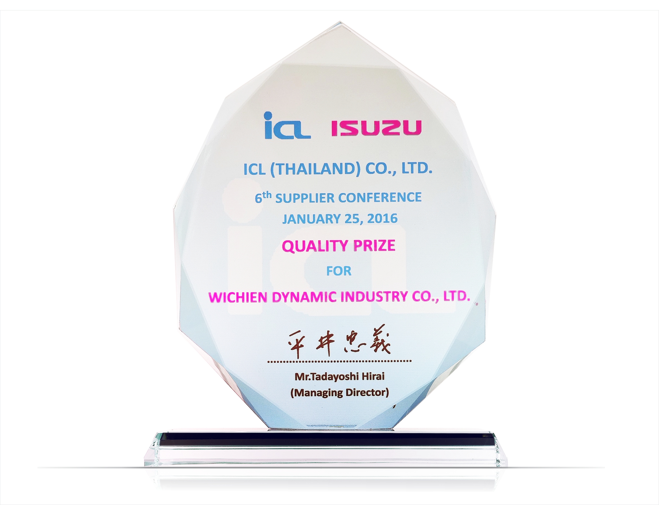Wichien Dynamic Industry Co., Ltd. received the Quality Prize at the 6th Supplier Conference 2016 from ICL (Thailand) Co., Ltd. – ISUZU, in recognition of excellent quality performance as a trusted supplier.